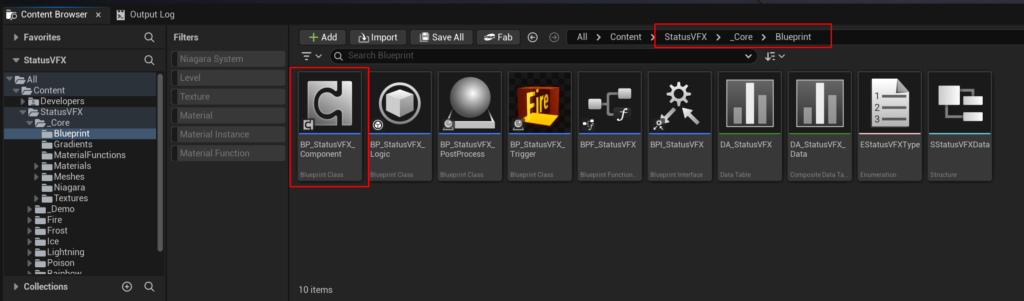 All logic for easy setup resides in the BP_StatusVFX_Component: