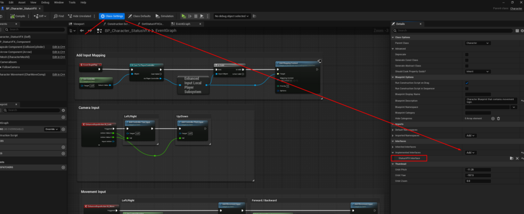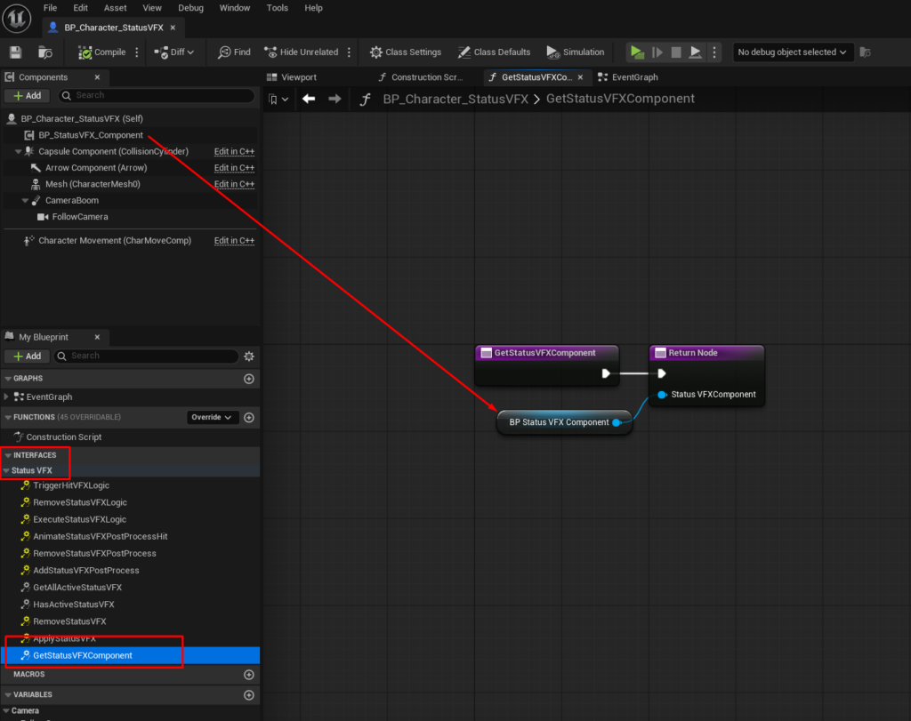 3. Go into the Interface functions and find the GetStatusVFXComponent function. Drag your newly created Status VFX Component into the return value.