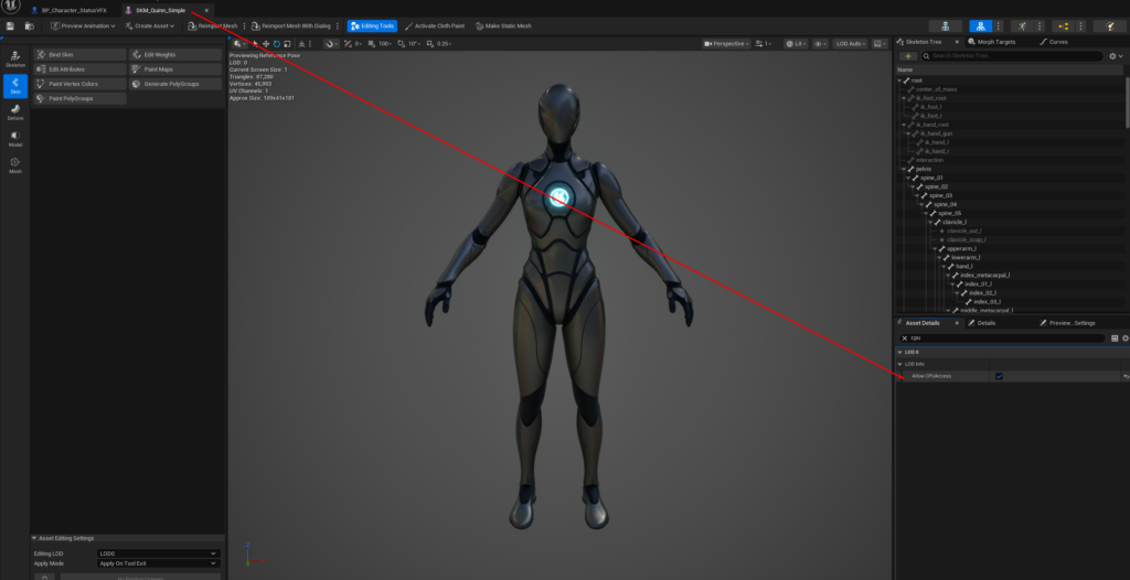 To improve the skeletal mesh sampling used in the Niagara effects, we want to allow Niagara to sample the Skeletal Mesh uniformly. We need to enable this inside the Skeletal Mesh itself: